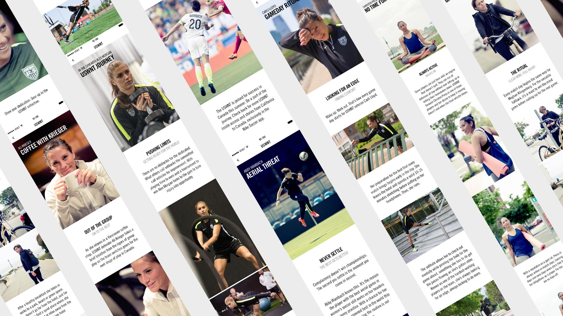 I was trusted partner of Nike Soccer, telling the story of the Women’s National Team journey into and through the 2015 World Cup. I was privileged to be a part of the USWNT journey from Game #1 of the qualifiers all the way to the final Game of the World Cup. I worked closely with Nike’s digital team in establishing the creative direction for all content for the Nike Soccer App, Social Media Channels and websites, establishing iconic images throughout the journey, defining the teams attitude upon entering the world cup.